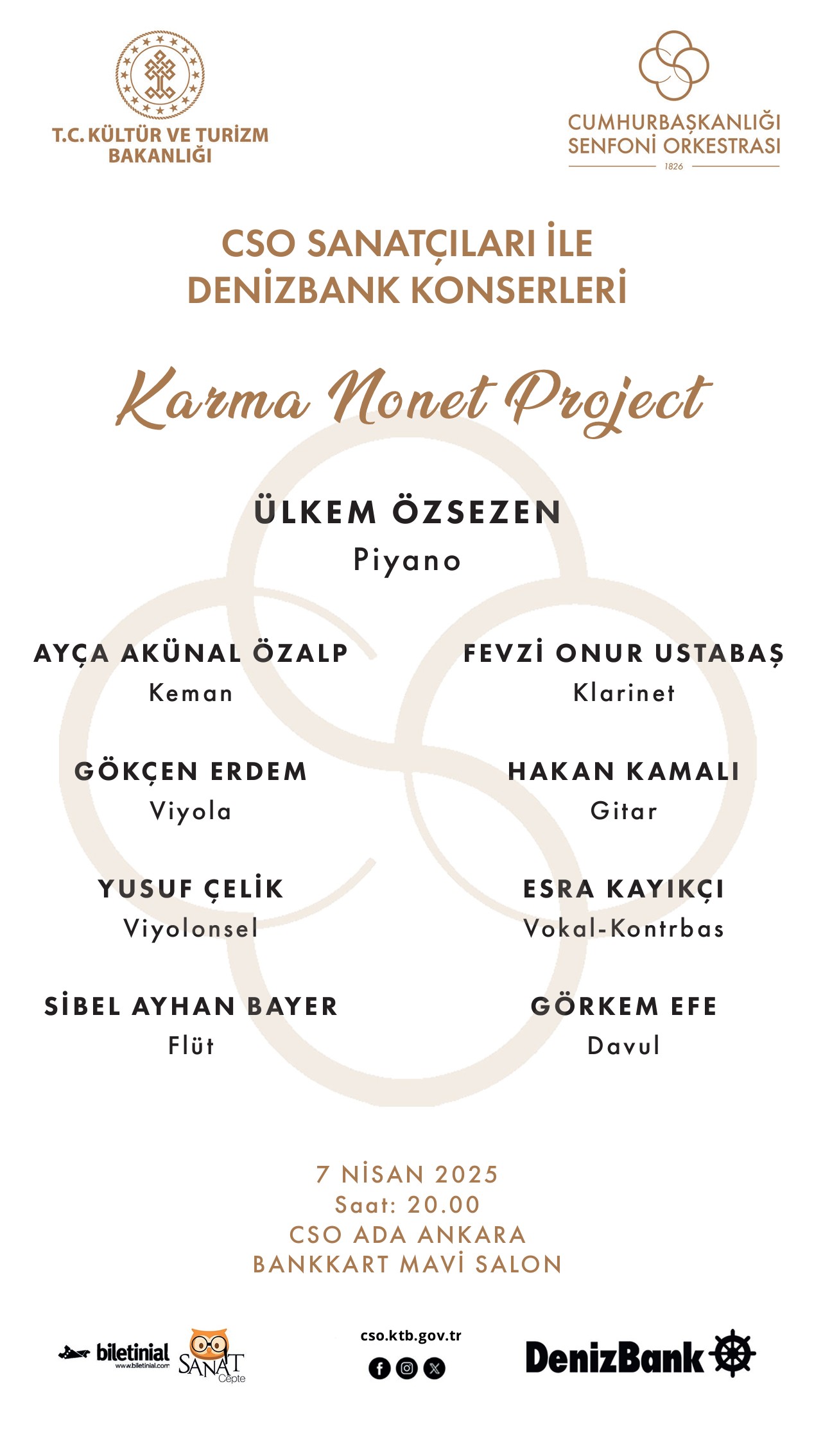 Ülkem Özsezen'in caz dörtlüsü ve CSO solistlerini biraraya getiren Karma Nonet, doğaçlama ile yazılı müziğin yan yana ve iç içe geçtiği, klasik form ile caz estetiğinin eşit bir ağırlıkla buluştuğu bir oda müziği projesidir.Bu ensemble, alışılmış sahne düzenlerinin ve konser kurallarının ötesine geçmeyi amaçlar. Performans sırasında: Yazılı ve doğaçlama sololar yan yana yer alır; yazılı pasajlar kimi zaman bir kadenza gibi yorumlanabilir. Müzisyenler sahnede tanıtılmaz; eser kendini isimler olmadan ifade eder. Parçalar arasında kısa duraklamalar olur, ancak müzik alkışlar üzerine aniden yeniden başlayabilir. Şef yoktur; tempo ve ritim, müzisyenlerin karşılıklı dinlemesi ve sezgisel uyumlarıyla ortaya çıkar. Müzisyenler gerektiğinde sahnede su içebilir; bu, müziğin yaşayan doğasına aittir. Parçaların sonları uzatılabilir; süre değil, ifade önceliklidir. Parçalar bir "count-in" ile başlar; bu giriş, çoğunlukla içsel bir işaretle ya da duyulabilir bir ritmik sinyalle gerçekleşir. Parça isimleri sahnede söylenmez; dinleyiciden, müzikle doğrudan ve sezgisel bir bağ kurması beklenir. Karma Nonet, müziği bir anlatım aracı olmaktan çok, bir deneyim alanı olarak sunar. Her performans, katılan her müzisyen ve her dinleyiciyle yeniden şekillenir.